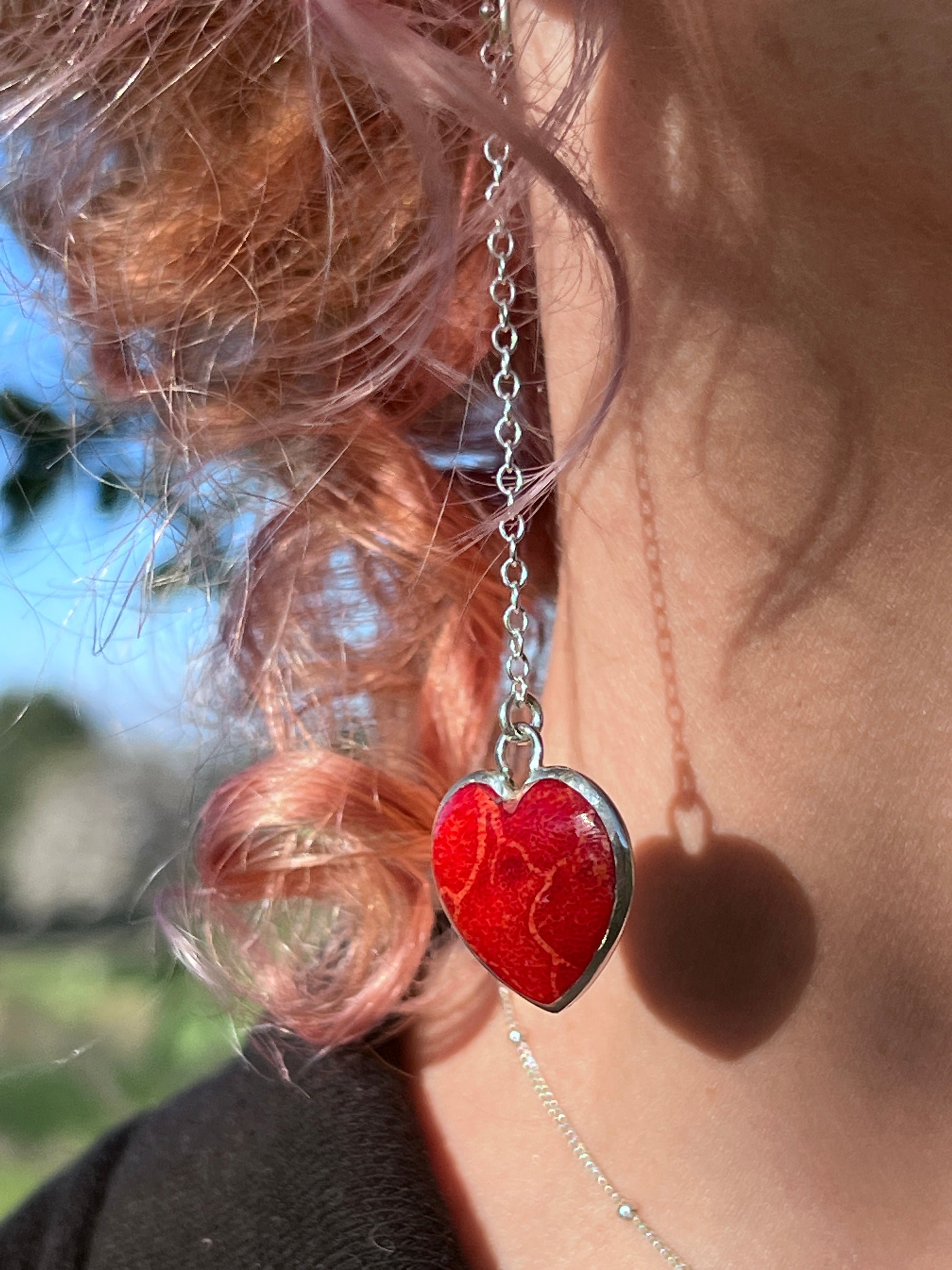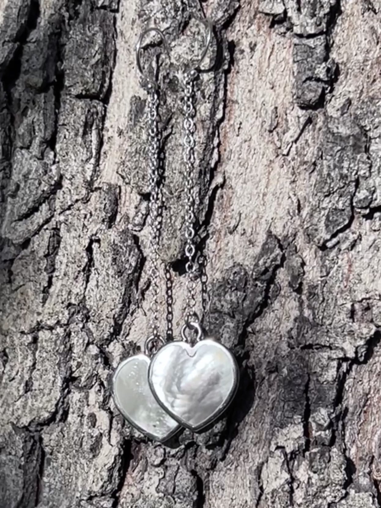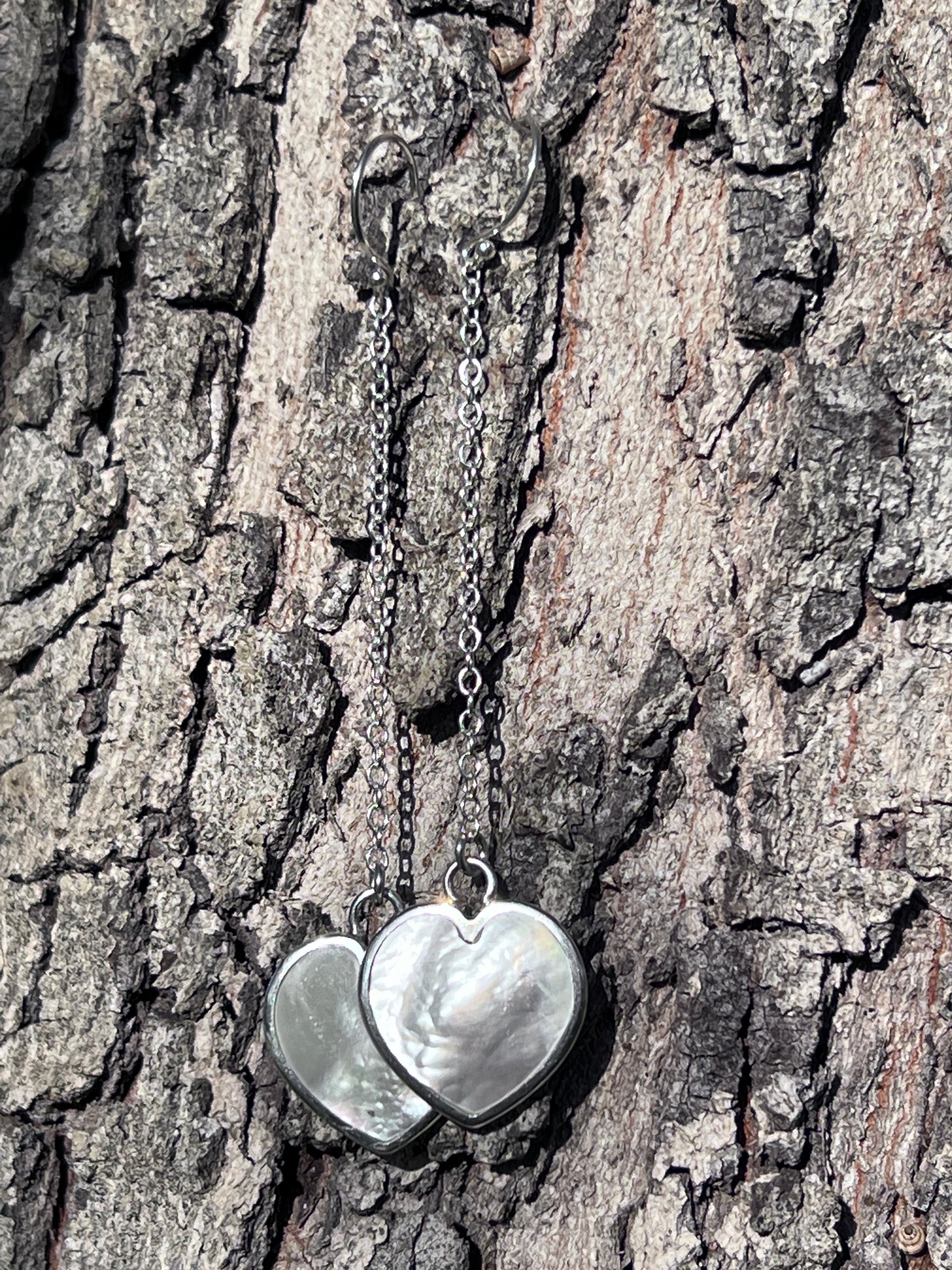 Handcrafted from 925 sterling silver, they feature a delicate chain with an 8mm silver centerpiece, ending in a white mother-of-pearl heart — a symbol of purity, intuition, and gentle strength.