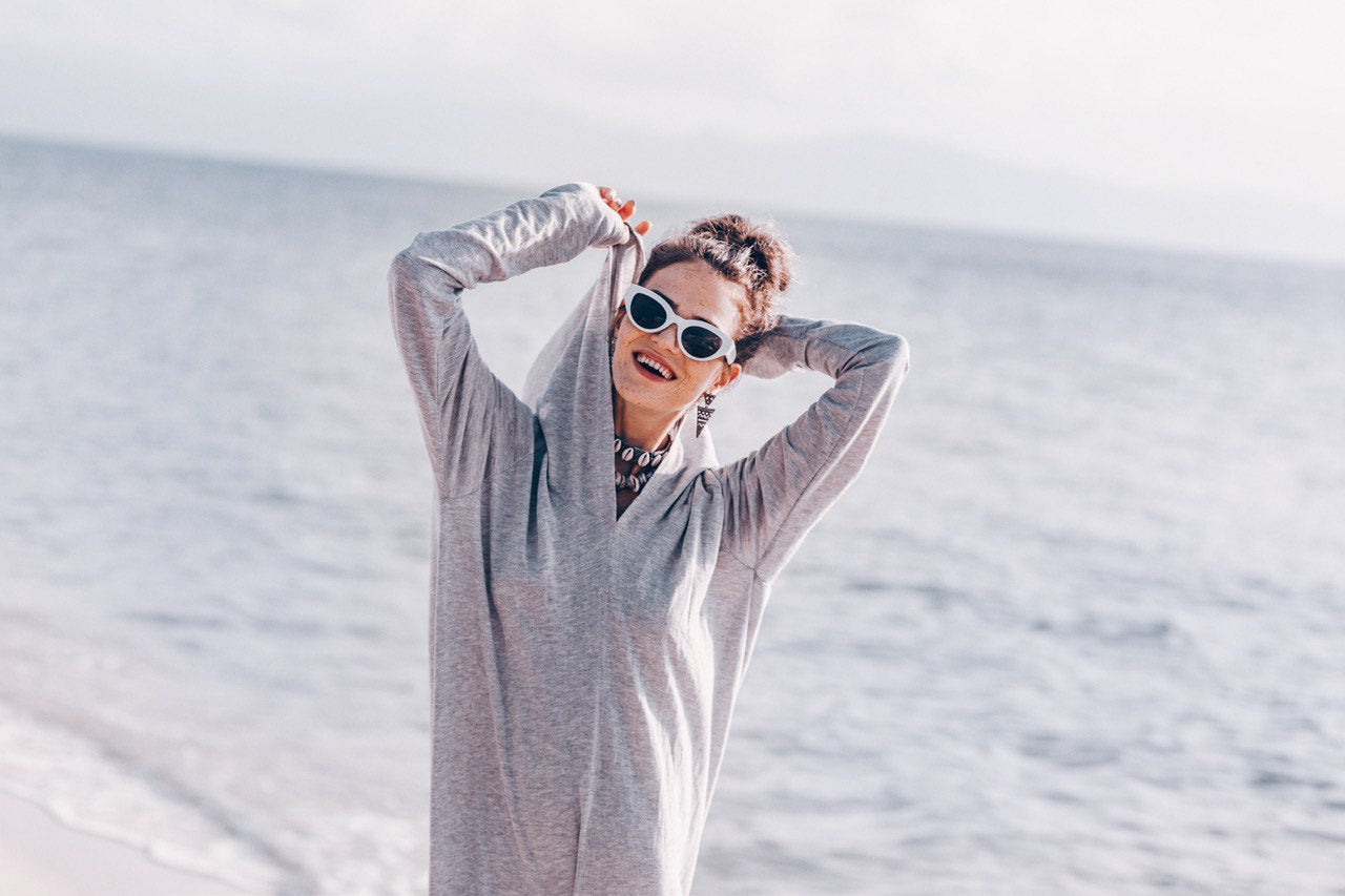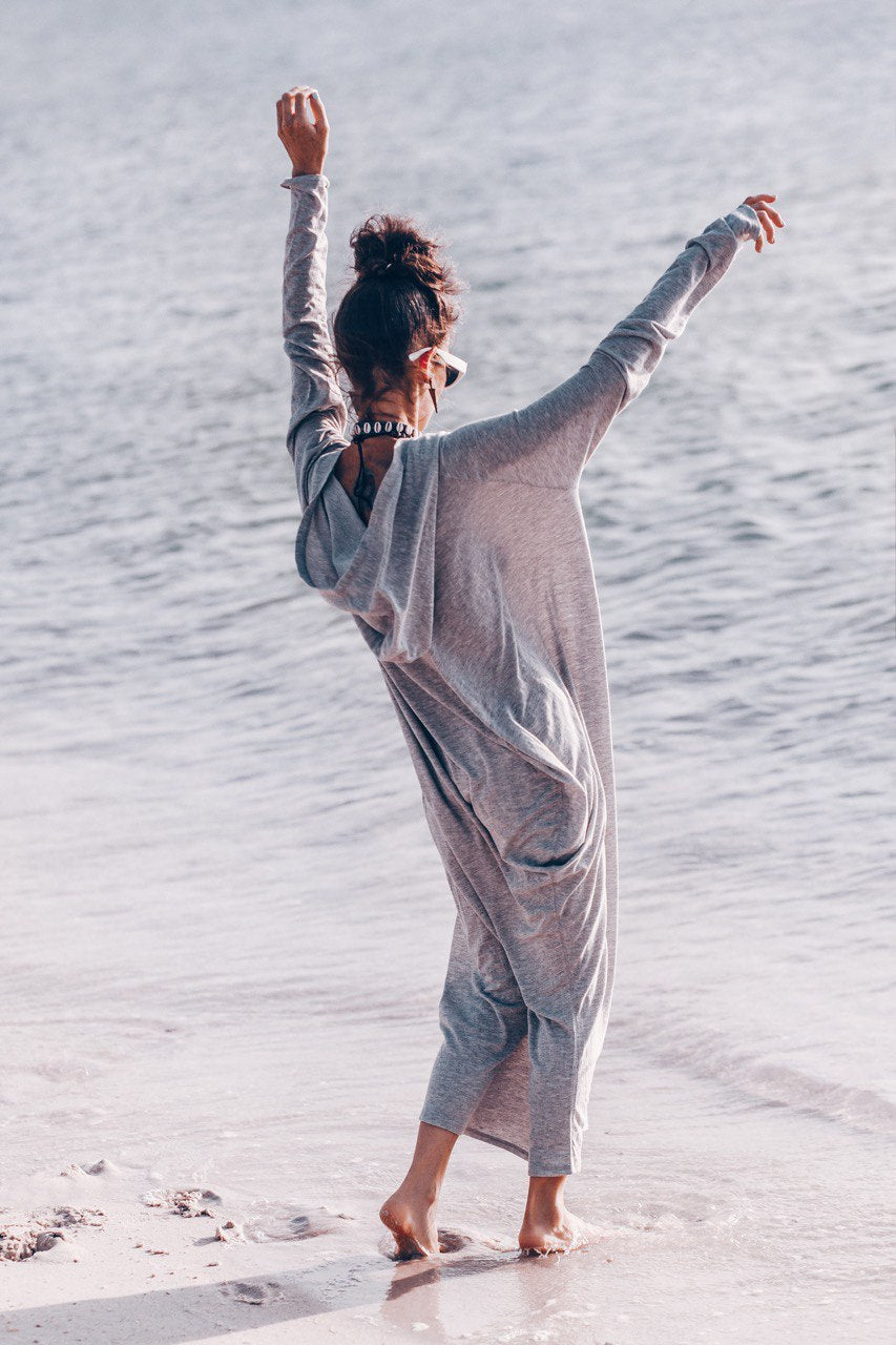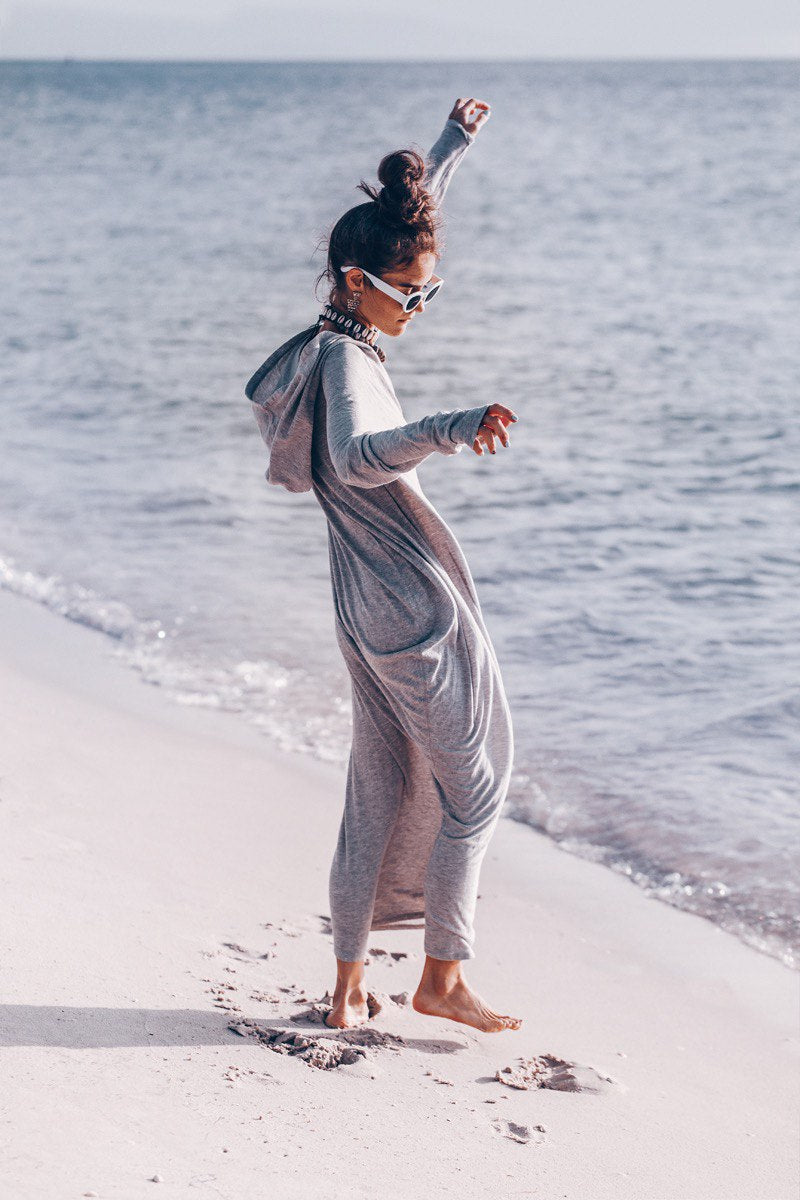 This version of the “Angel on Vacation” dress is made from buttery-soft, warm organic cotton in a serene light grey hue. Designed for colder days or simply for those seeking deeper comfort, it wraps the body like a gentle hug.