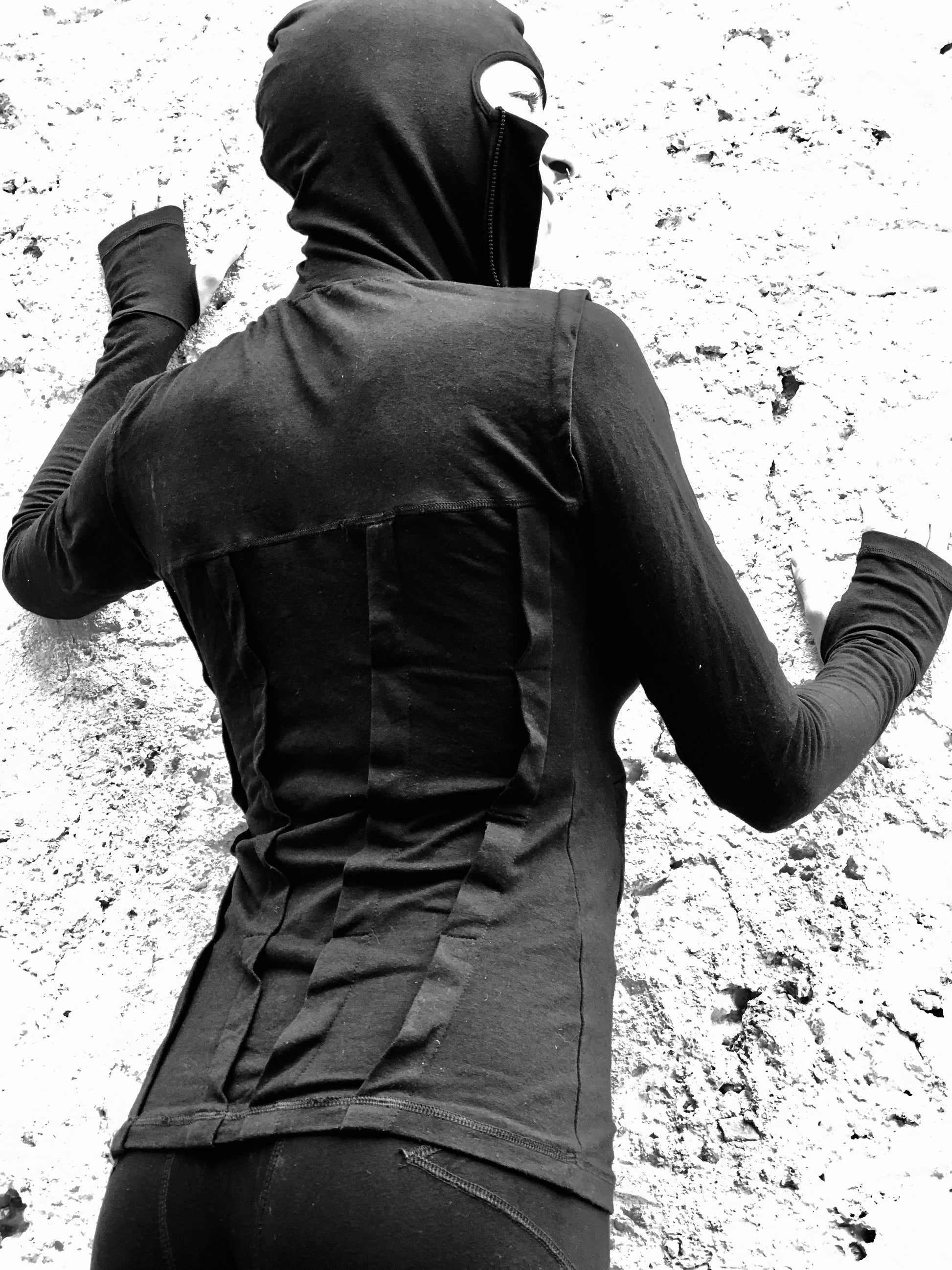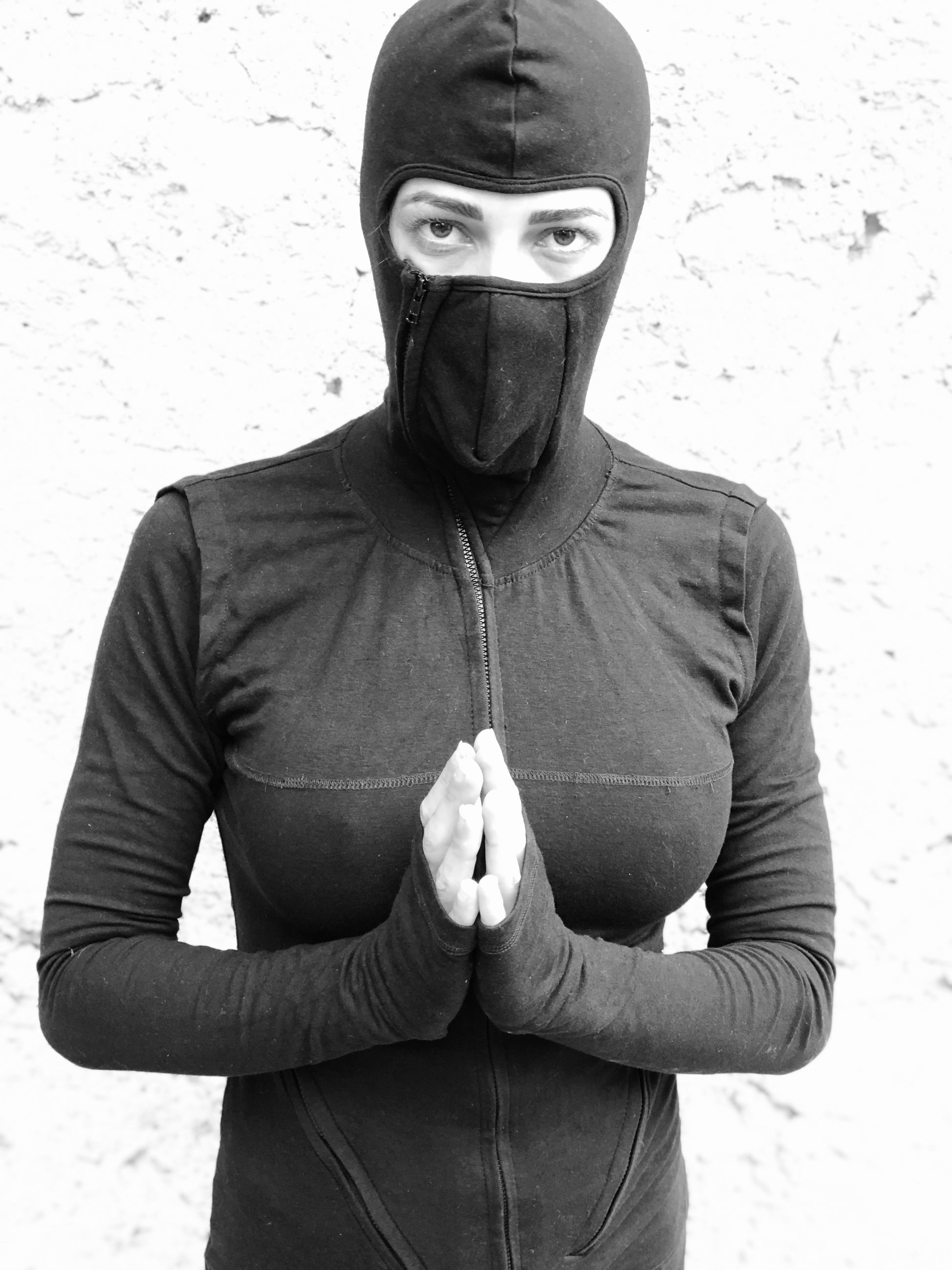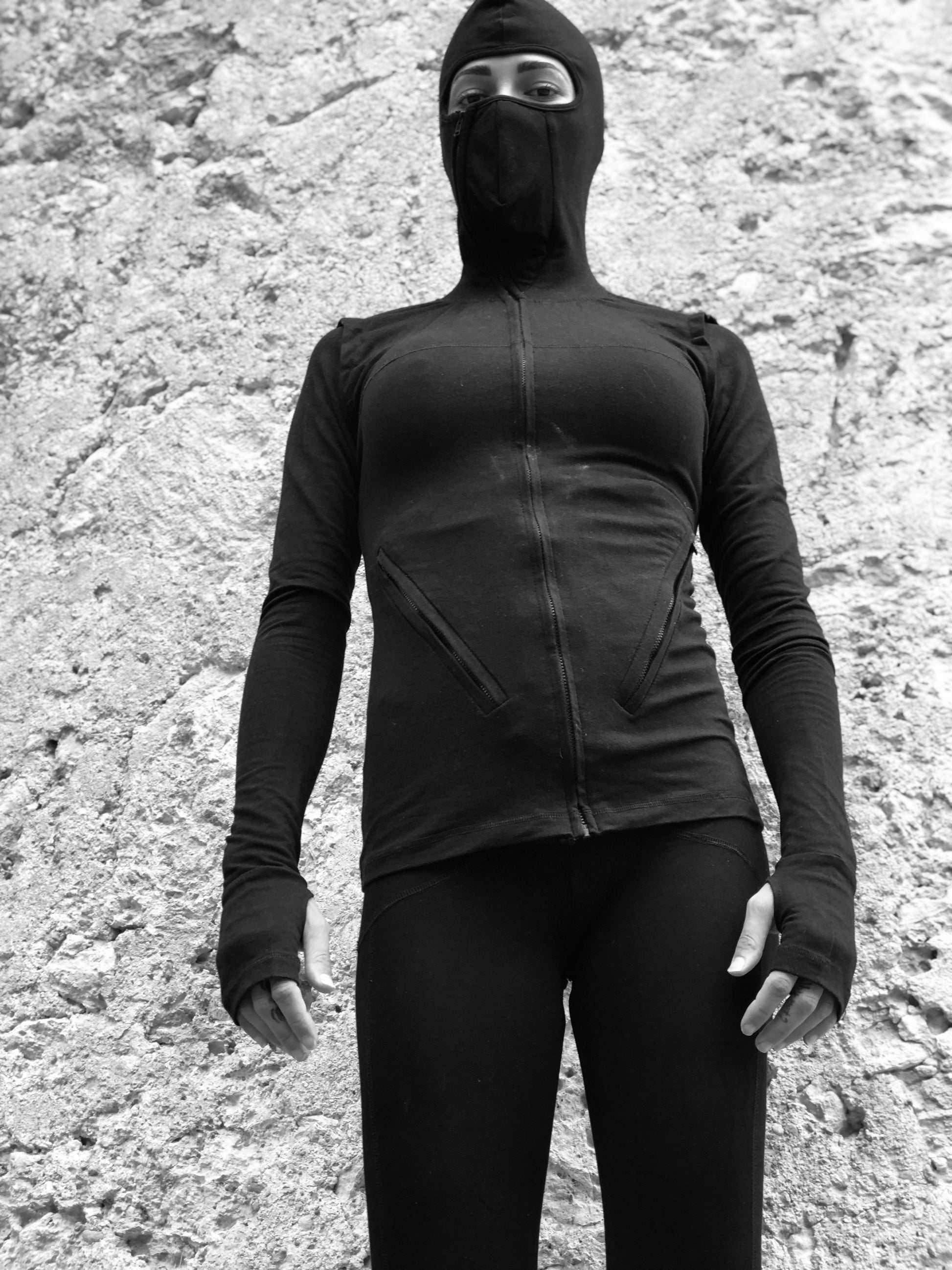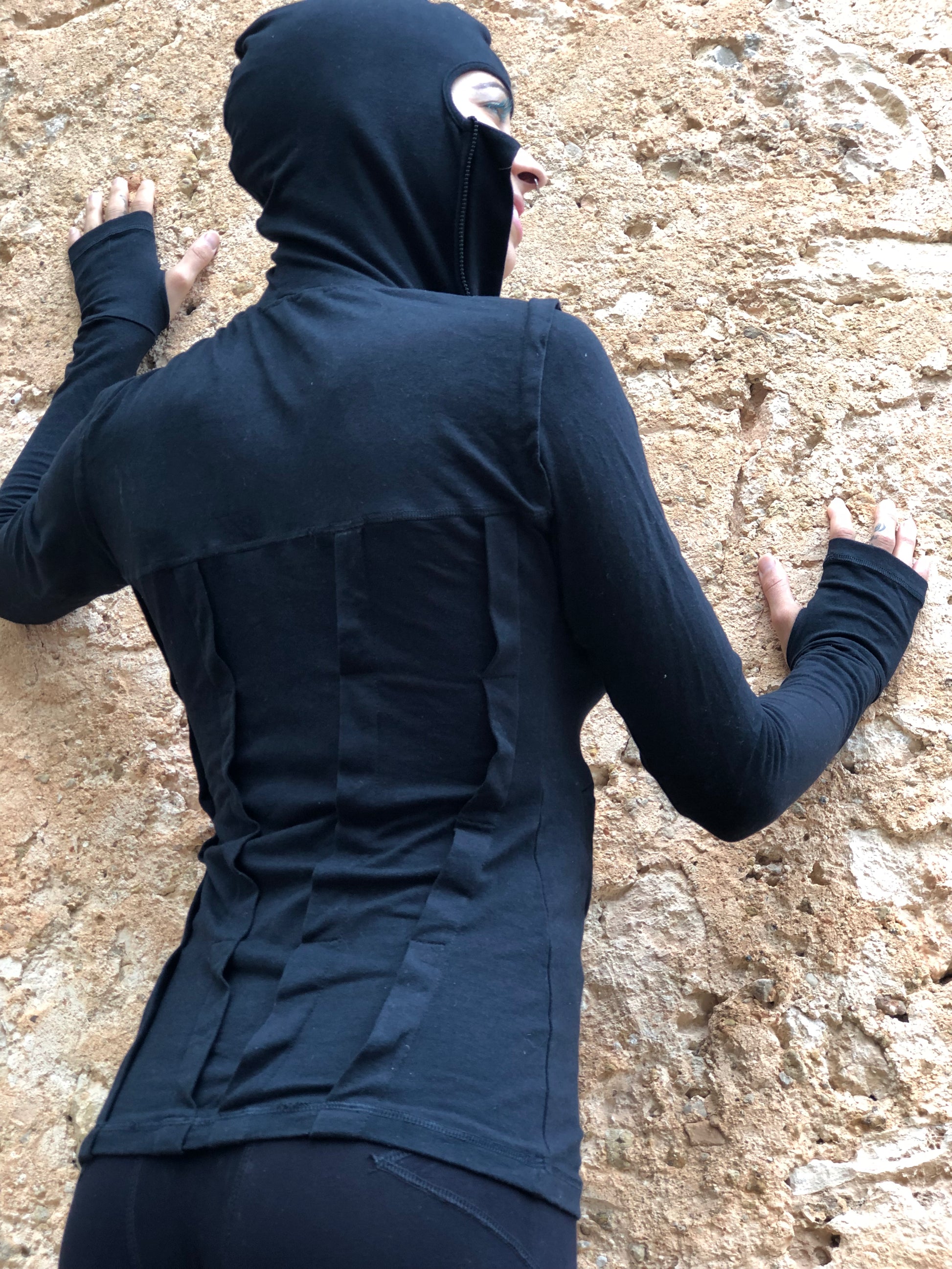 Designed for fierce femininity and comfort, our women’s ninja hoodie offers a sleek, face-covering zip design that leaves only the eyes visible. Made from ultra-soft bamboo or rayon, it’s breathable, eco-friendly, and features secret pockets and a slim, minimalist hood. A bold, expressive statement in motion.