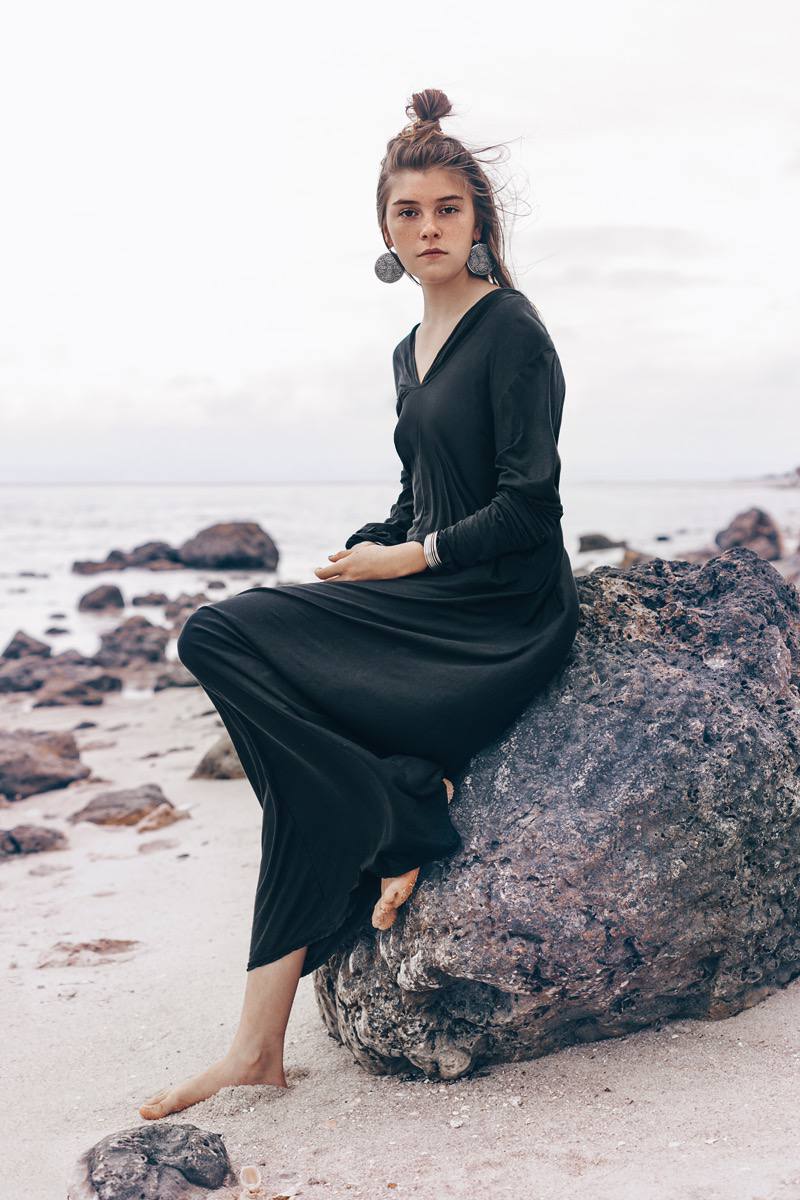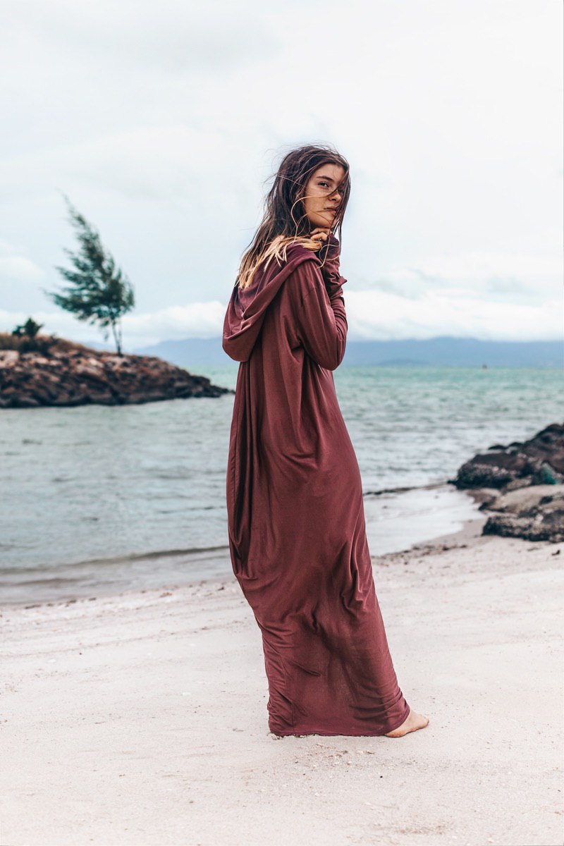 This long hooded dress is crafted from airy, luxurious Suprima cotton, designed to feel like a second skin under the sun. With slim, linear sleeves and an oversized hood, it offers both shelter and grace—a piece you can disappear into or emerge from like a vision.