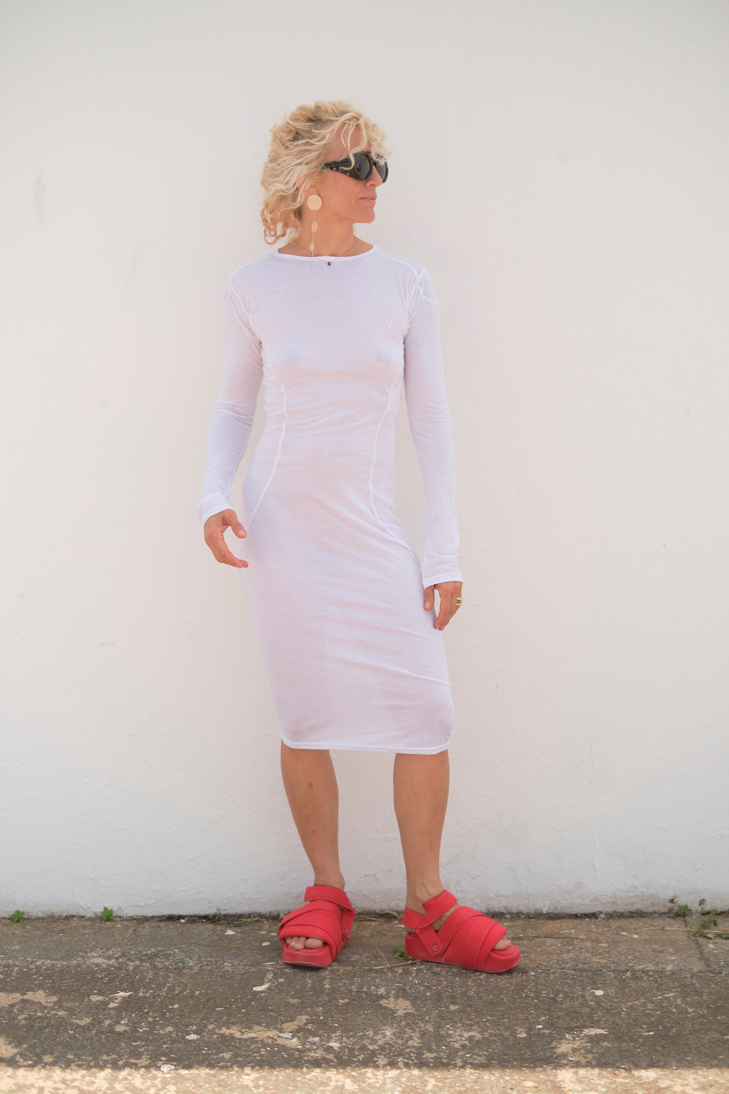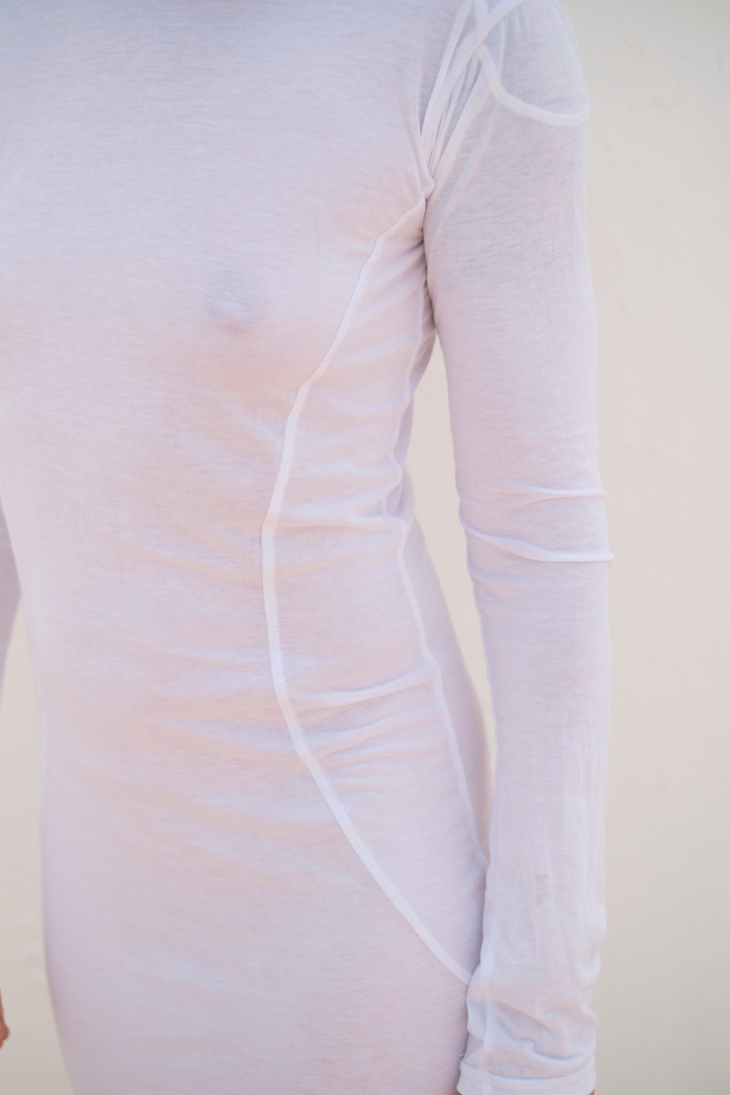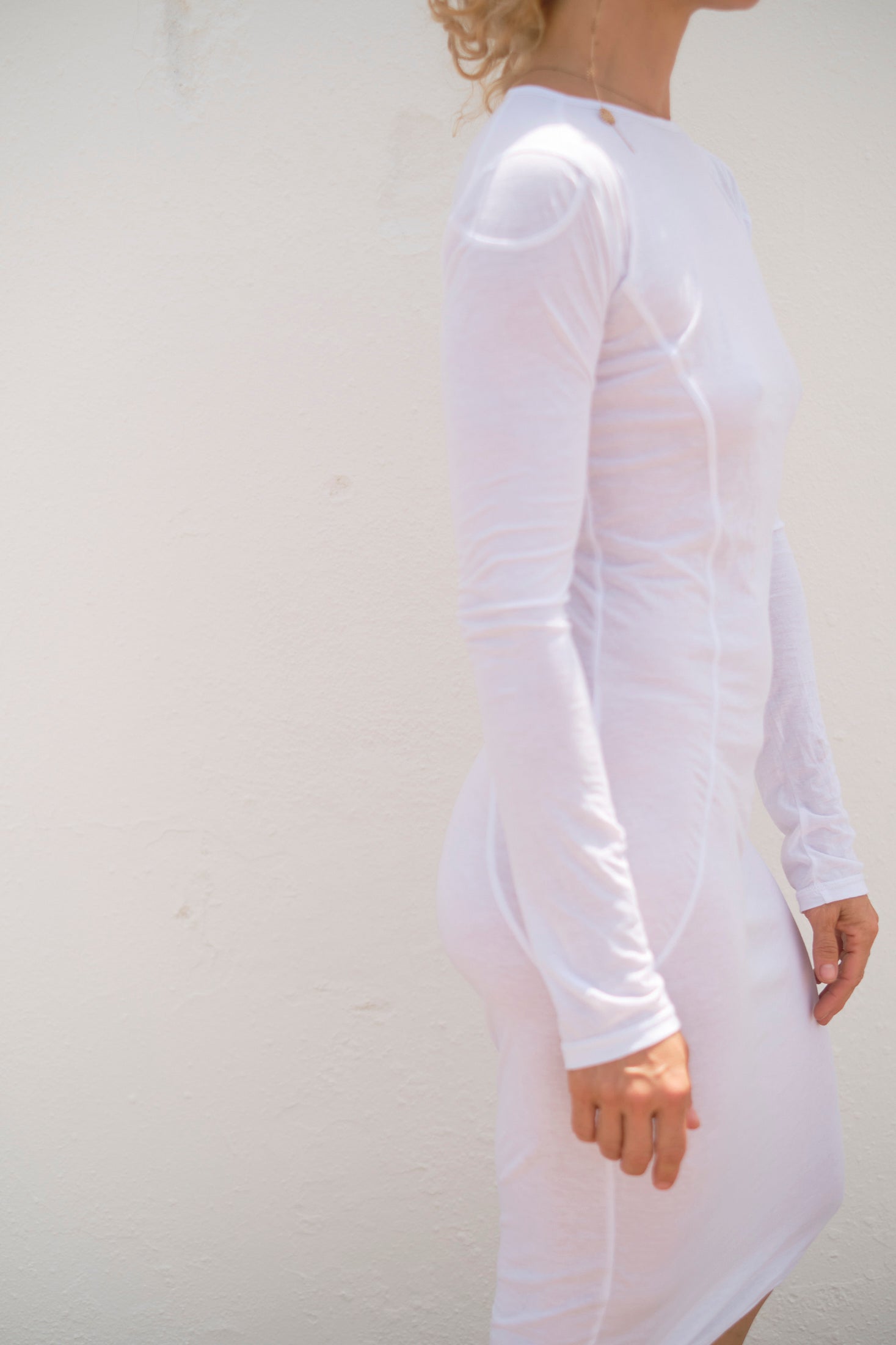Experience the elegance of simplicity in this ultra-lightweight dress crafted from the world’s finest cotton — Cotton Suprima. Inspired by the refined aesthetics of Japan, this dress embodies quiet beauty and mindful design. Featuring slim long sleeves and a soft, rounded neckline, it gently embraces the body, offering a unique silhouette that feels like a second skin.